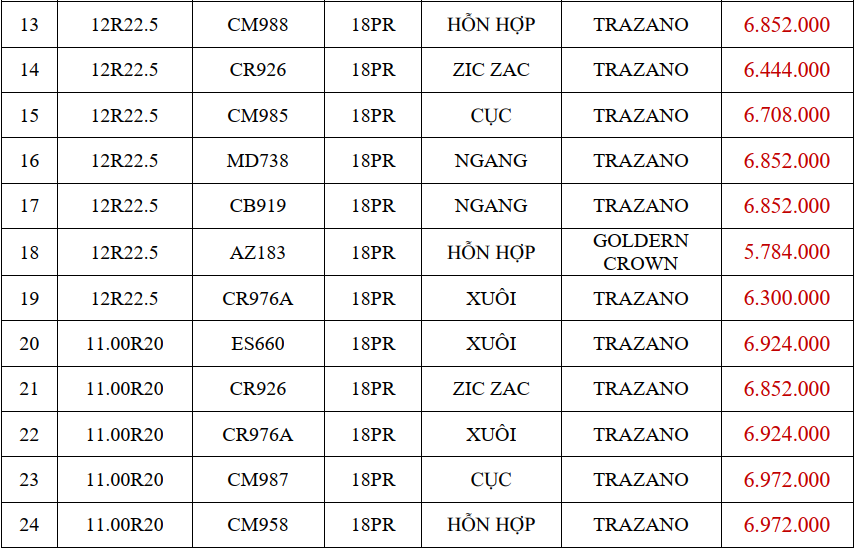 BẢNG GIÁ LỐP TRAZANO