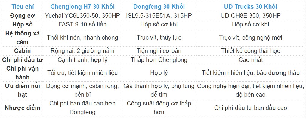 Dongfeng 30 khối: Sử dụng động cơ ISL9.5-315E51A công suất 315 mã lực, dung tích 9.460 cm3. Mặc dù dung tích lớn hơn, công suất của Dongfeng thường thấp hơn so với Chenglong H7, nhưng vẫn đảm bảo khả năng vận hành ổn định.