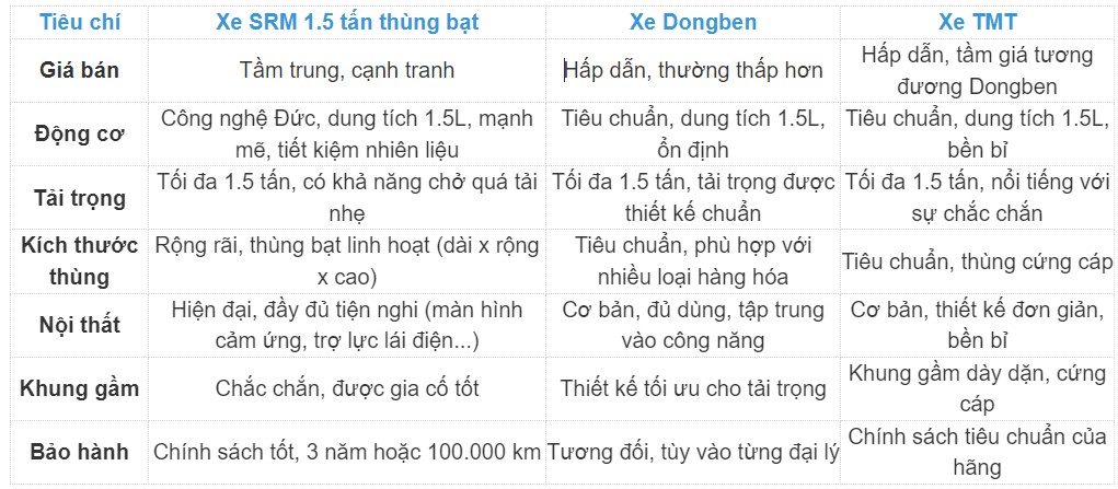 BẢNG SO SÁNH TỔNG QUAN: SRM 1.5 TẤN VS. DONGBEN VS. TMT